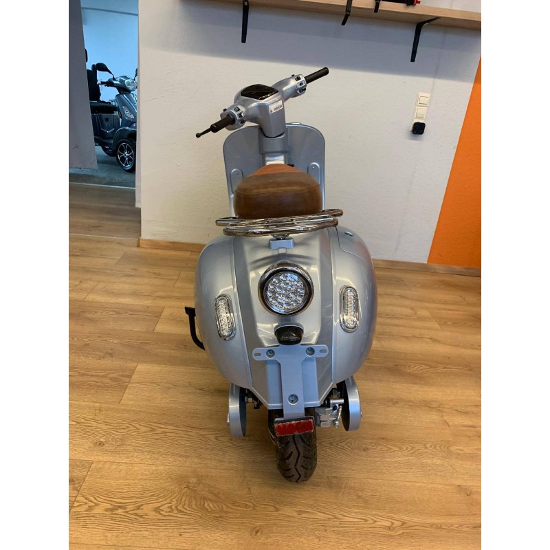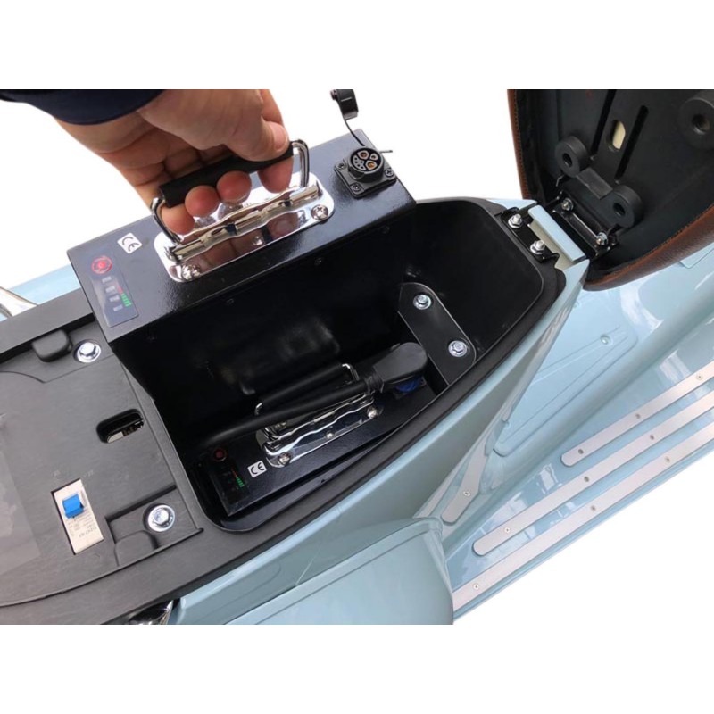 Angetrieben wird der Elektromotor durch zwei herausnehmbare Lithium-Ionen-Akkus, die - je nach Fahrstil - eine Reichweite von bis zu 100 km sowie ca. 1000 Ladezyklen erlaubt. Wird beispielsweise alle 4 Tage aufgeladen, vergeht ein rundes Jahrzehnt, bis der Akku letztlich ausgetauscht werden muss. Der herausnehmbare Akku besitzt einen Tragegriff, was das Aufladen erheblich erleichtert und flexibel gestaltet. So müssen Sie mit dem 'Classico' nicht zwingend an einer E-Ladesäule halten, sondern entnehmen schlichtweg den etwa 9 kg schweren Lithium-Ionen-Akku (72V/20Ah Akku) und laden ihn für 2 bis 4 Stunden an einer gewöhnliche Steckdose, sei es zu Hause, im Büro oder im Urlaubshotel. Das dafür nötige Ladegerät können Sie im integrierten und abschließbaren Staufach des E-Rollers überallhin mitführen.