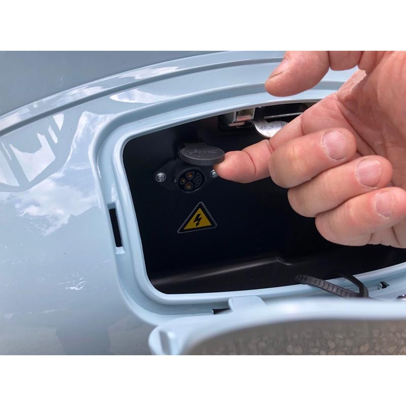 Die Lithium-Akkus können über eine Steckverbindung im Seitenfach auch alternativ direkt im E-Roller aufgeladen werden