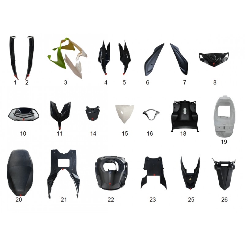 Die Kunststoffteile der Modelle Falcon, Falcon Double, Falcon Double Max Range und Falcon Highspeed sind weitgehend identisch, bis auf folgende Ausnahmen: