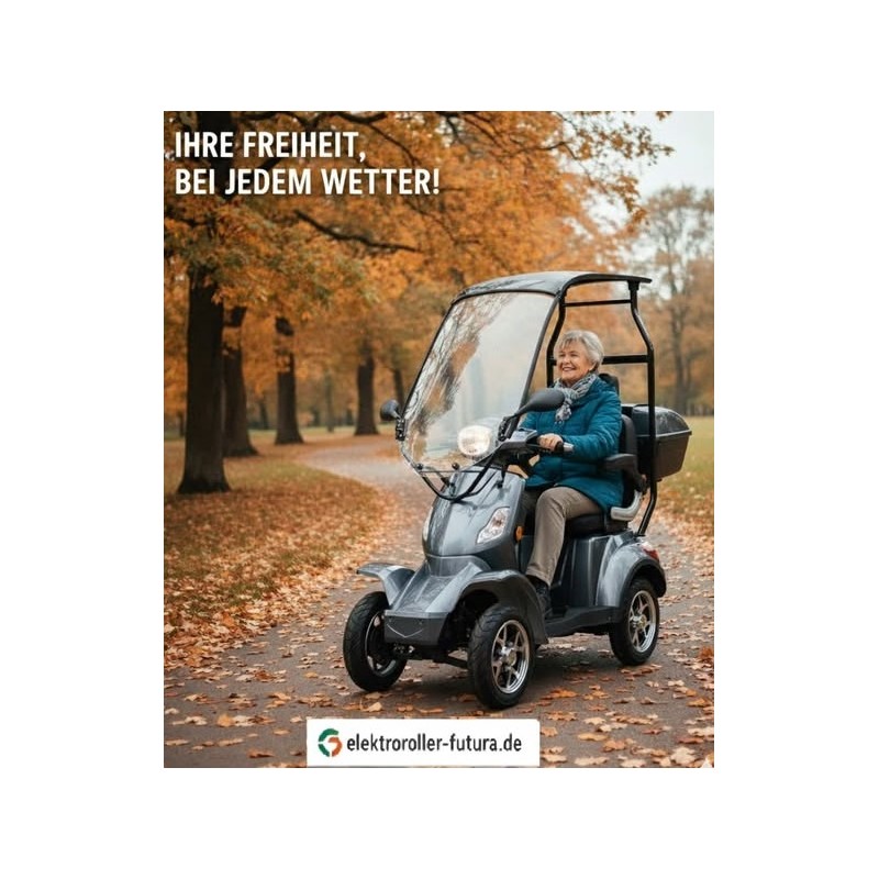 Elektromobil Vita Care 4000, 25 km/h, 1000 Watt, Straßenzulassung, bis zu 50 km Reichweite, Straßenzulassung, Dach, Blei-Gel-Akku, LED-Licht, Fahrsicherheit und Stabilität durch 4 Räder, Rückwärtsgang, Scheibenbremse, Topcase.