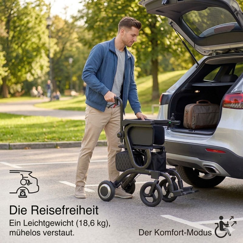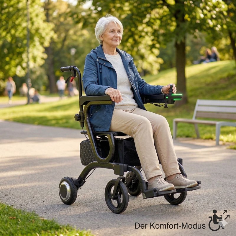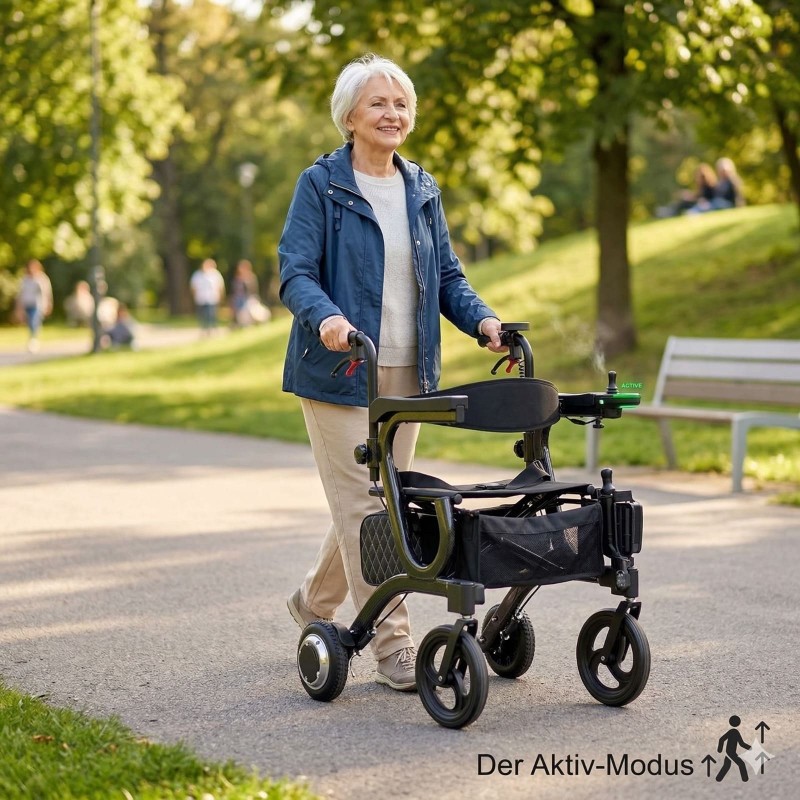 Kennen Sie das? Der Wunsch nach einem Spaziergang ist groß, aber die Sorge, dass die Kraft auf halber Strecke nachlässt, schwingt immer mit. Herkömmliche Rollatoren bieten zwar Halt, verlangen aber bei Steigungen oder langen Wegen viel Anestrenung. Die Folge: Man bleibt öfter zu Hause, die Muskulatur baut ab.